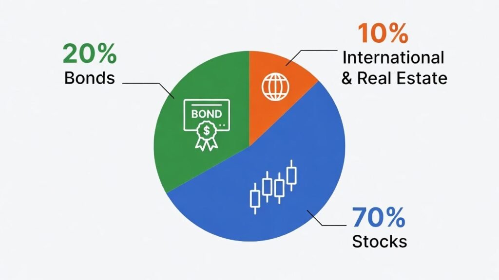 Mix stocks, bonds, and maybe real estate. Stocks grow more but swing hard. Bonds are steady but grow less.